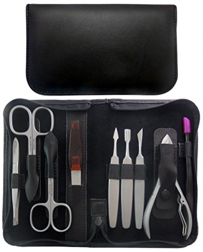 Set Manicure & Pedicure 9 Pezzi Inox in Vera Pelle Nera Nappa con Cerniera - Tenartis 393 Made in Italy