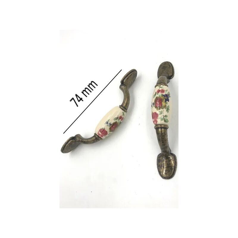 Maniglia per mobile in ottone antichizzato con inserto in porcellana bianca con disegno fiori rosa. Interasse di foratura mm.74