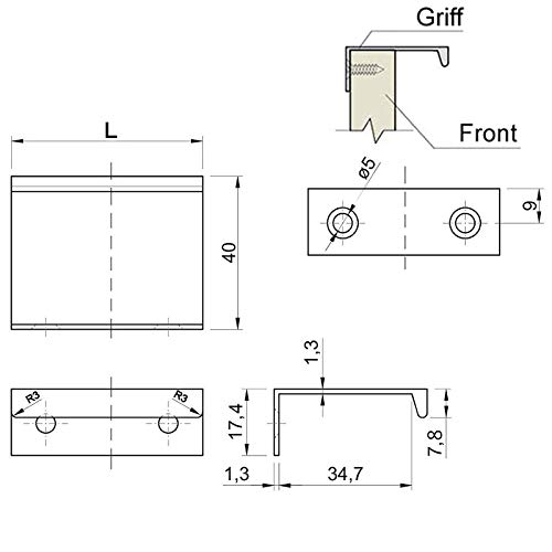 Lunghezza maniglia (L): 480 mm / Altezza maniglia anteriore/posteriore: 7,8 / 17,4 mm / Profondità: 40 mm / Distanza tra i fori: 4 x 110 mm