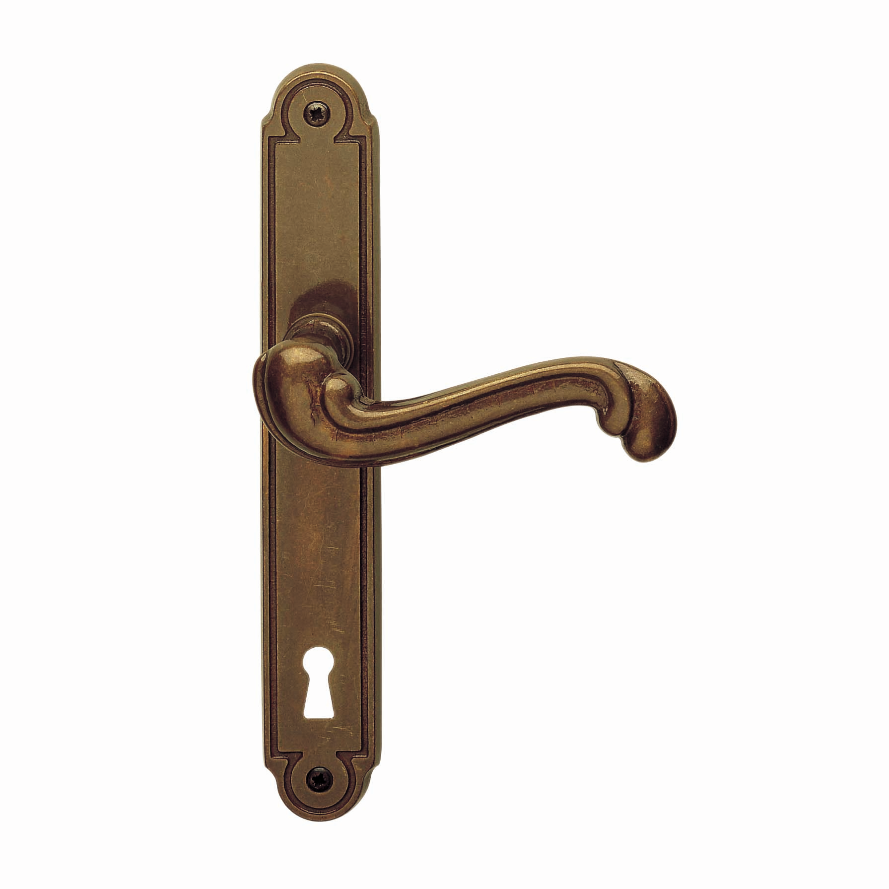 Maniglia con placca in Ottone Anticato. Indicata per porta da interno battente con serratura patent