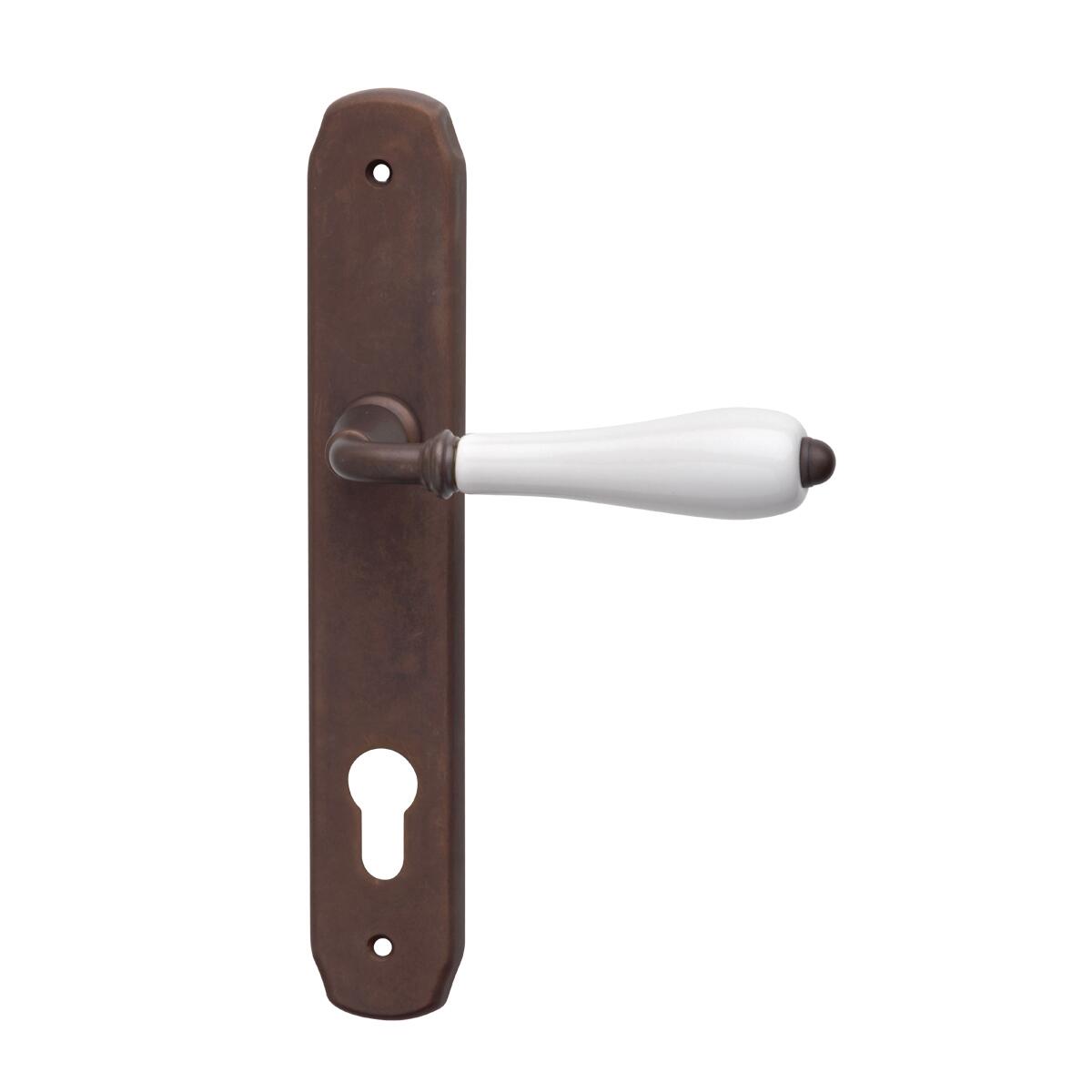 Maniglia con placca in Ottone Anticato. Indicata per porta da interno battente con serratura patent