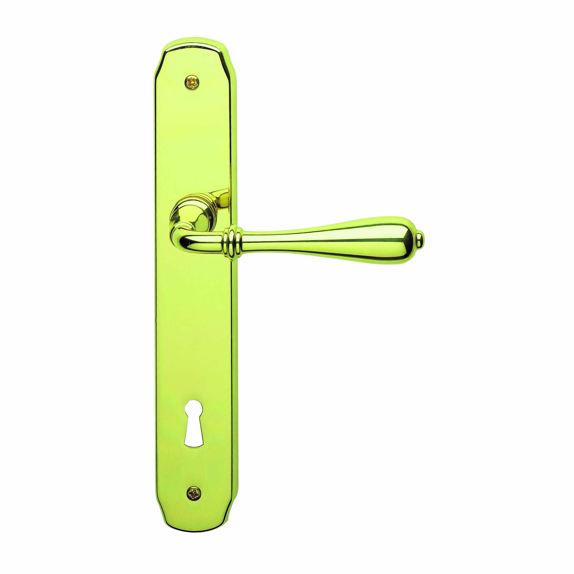 Maniglia con placca in Ottone Lucido. Indicata per porta da interno battente con serratura patent