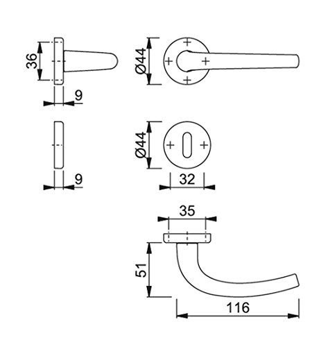 Confezione: 2 maniglie, 2 rosette, 2 bocchette con foro ovale, 1 perno 8 mm e viti montaggio