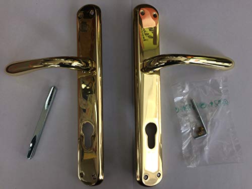 Maniglia per porta sidney 1126 p in maritech oro lucido, foro cilindro yale, con placca interasse mm.85 completa per una porta dentro+fuori, con molla di ritorno viti di fissaggio comprese