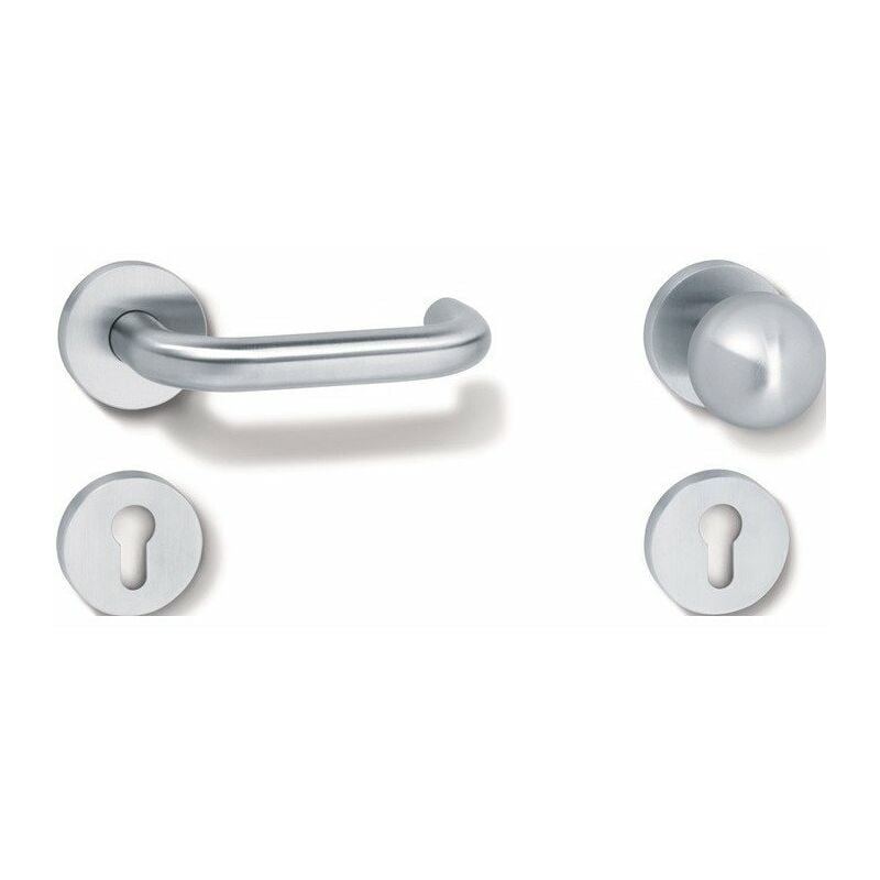 Wechselgarnitur 111XAH13.139 in H-Technik mit Rosetten nach DIN 18255 und DIN EN 1906 · aus Edelstahl · bestehend aus: Knopf Modell 109X aus Edelstahl und Türdrücker Modell 111X... aus Edelstahlrundrohr (1.4301) · Durchmesser 21,3 mm mit 1,5 mm Wandstärke · mit Ansatzführung und Rastnut · mit Gewindestift M5 als zusätzliche Fixierung der Türdrücker mit dem Vierkantstift zur optimalen Kraftübertragung in das Türblatt · der Drücker erfüllt die Vorgaben der DIN EN 179 und DIN 18040 · Montage durch einfaches Einrasten der Türdrücker in die auf der Tür vormontierten Unterteile · die Rastung kann mittels Demontageschlüssel wieder gelöst werden · Rosetten 305.21X... und 306.23X... · Unterkonstruktion 305.21X... in Kunststoff-Stahlverbundbau mit schwarzer Zink/Nickel-Oberfläche für optimalen Korrosionsschutz · integriertes Hochhaltemodul mit Federunterstützung - DIN links und DIN rechts verwendbar - zur Unterstützung des Schlosses für eine längere Lebensdauer · Festdrehbarlagerung der Drücker