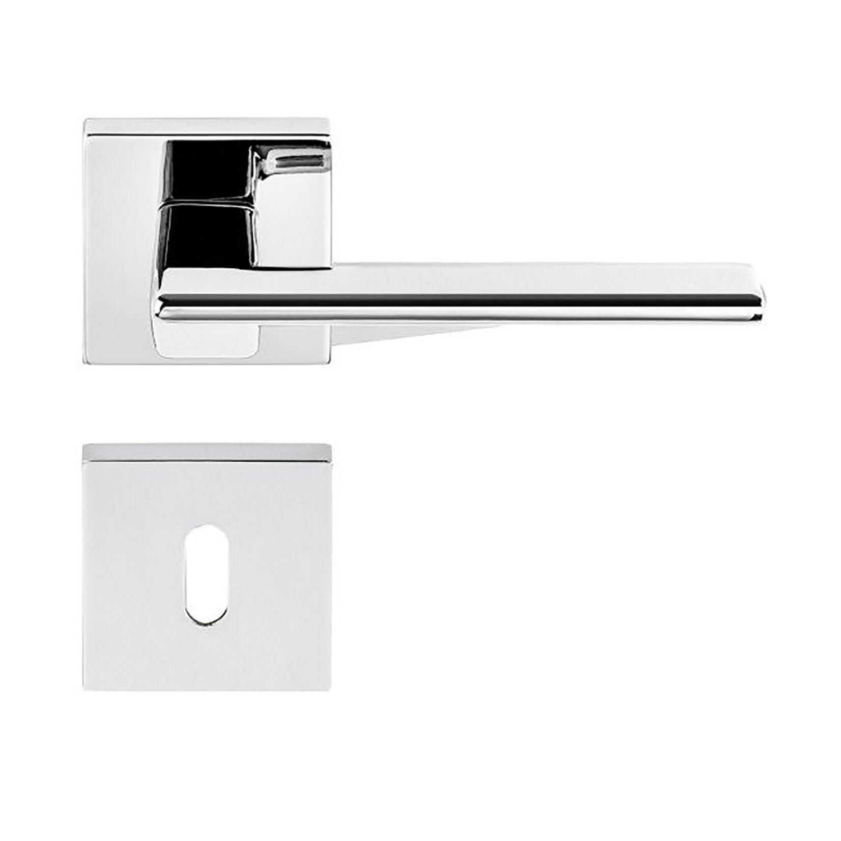 Maniglia su rosetta e bocchetta in Zama Cromo lucido. Indicata per porta da interno battente con serratura patent. Design di qualità e durata superiore alla media