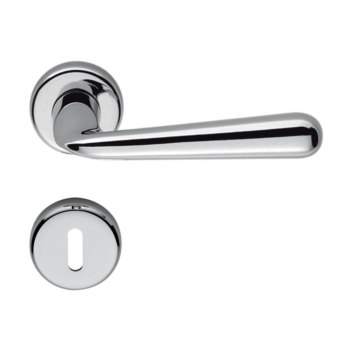 Maniglia con rosetta e bocchetta in Zama Cromo lucido. Indicata per porta da interno battente con serratura patent