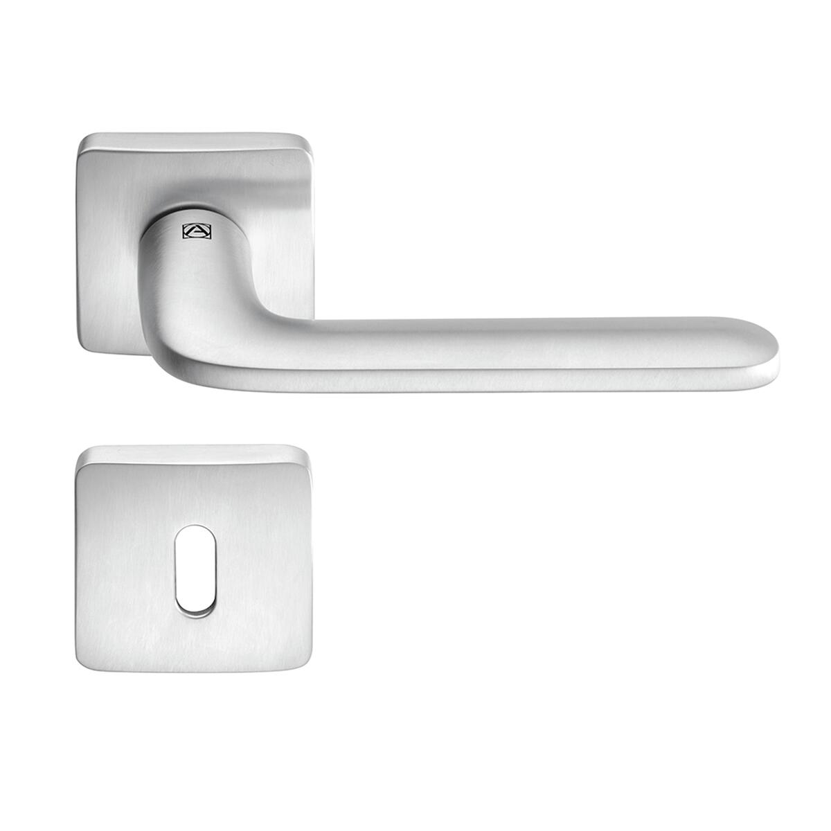 Maniglia con rosetta e bocchetta in Zama Cromo satinato. Indicata per porta da interno battente con serratura patent. Design di qualità e durata superiore alla media