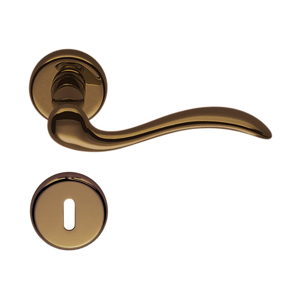 Maniglia con rosetta e bocchetta in Ottone Bronzo anticato. Indicata per porta da interno battente con serratura patent. Design di qualità e durata superiore alla media