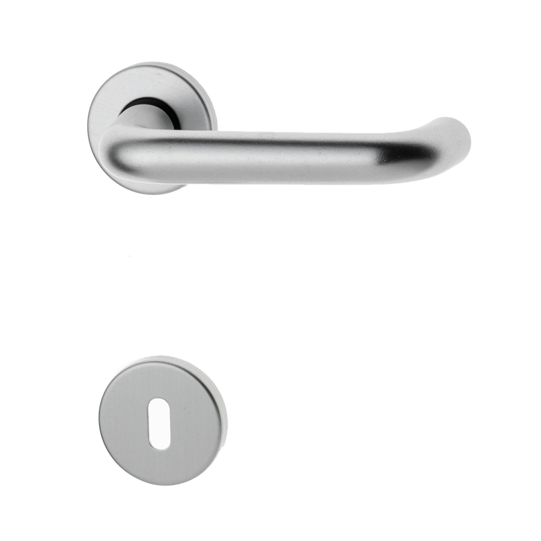 Maniglia con rosetta e bocchetta in Alluminio Argentato. Indicata per porta da interno battente con serratura patent. materiale e finitura: ALLUMINIO ANODIZZATO ARGENTO contenuto confezione: bilancino spinato (2 Impugnature + Ferro), 2 rosette diametro 45 senza molla, 2 bocchette diametro 45, 1 confezione viti legno