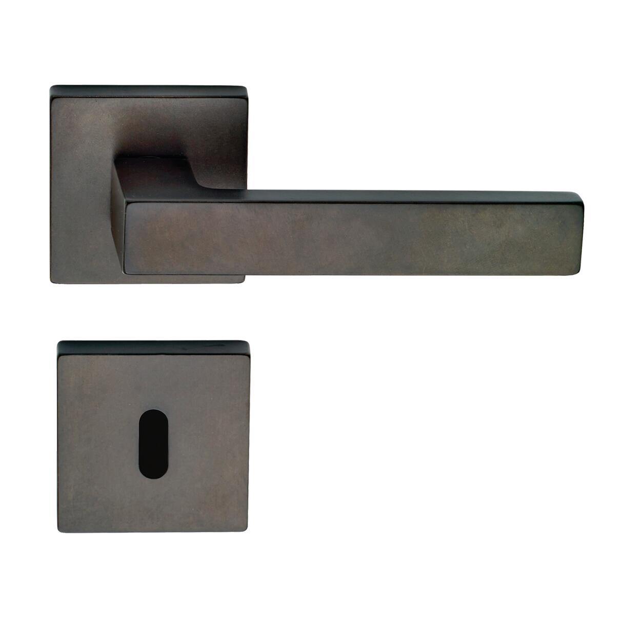 Maniglia con rosetta e bocchetta in Zama Anticato. Indicata per porta da interno battente con serratura patent