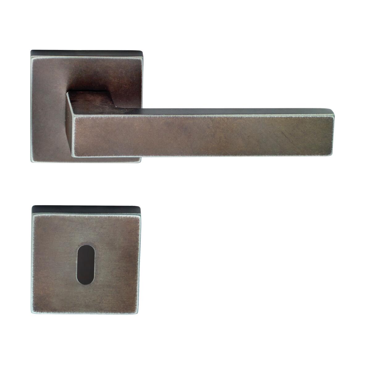 Maniglia con rosetta e bocchetta in Zama Anticato. Indicata per porta da interno battente con serratura patent