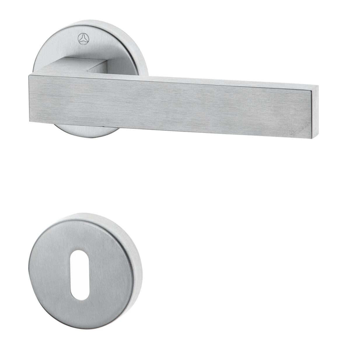 Maniglia con rosetta e bocchetta in Zama Cromo satinato. Indicata per porta da interno battente con serratura patent