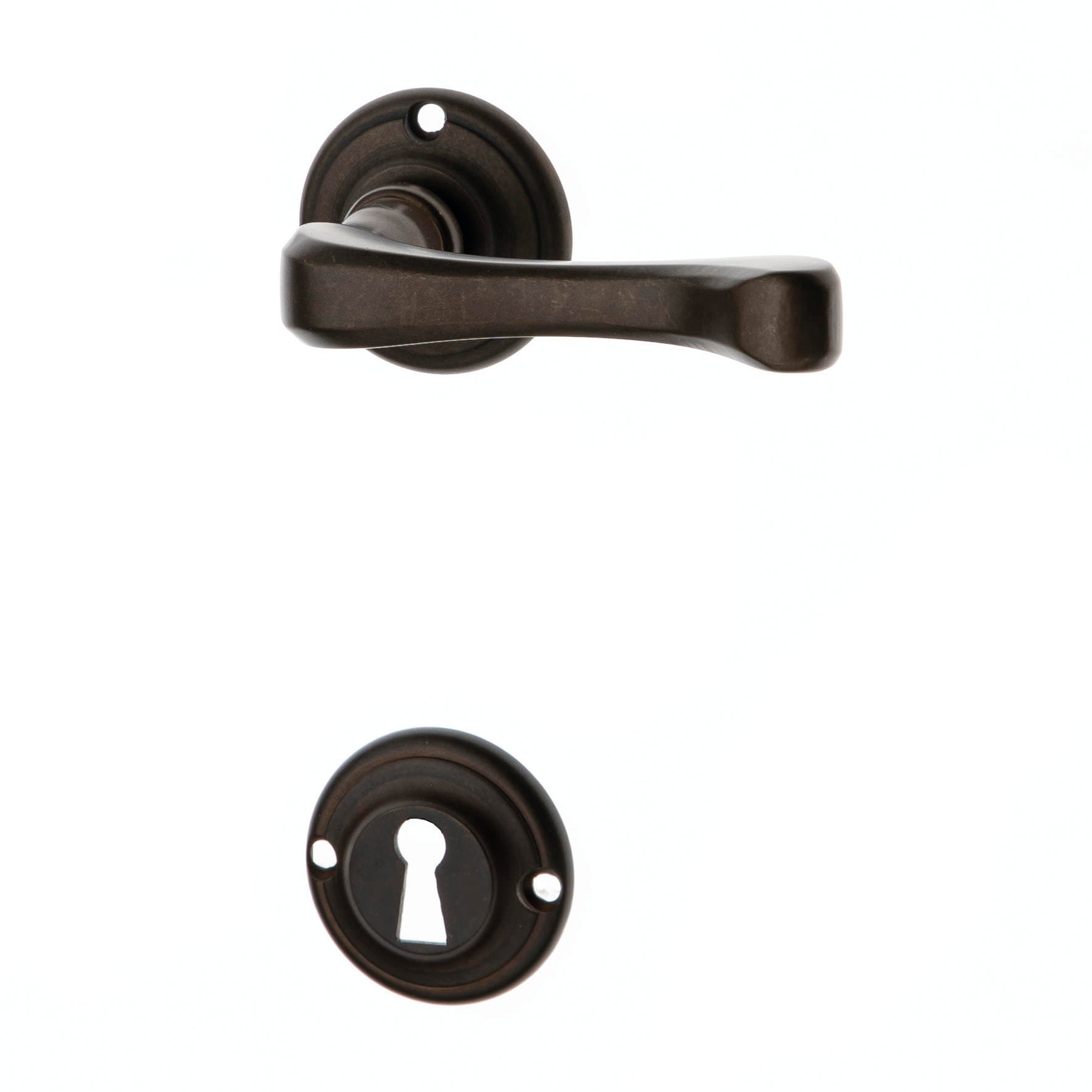 Maniglia con rosetta e bocchetta in Ottone Bronzo anticato. Indicata per porta da interno battente con serratura patent. materiale e finitura: OTTONE BRONZATO OPACO contenuto confezione: 2 impugnature su rosetta viti vista, 1 ferro, 2 rosette diam 45, 2 bocchette diam 45, 1 confezione viti legno+grani