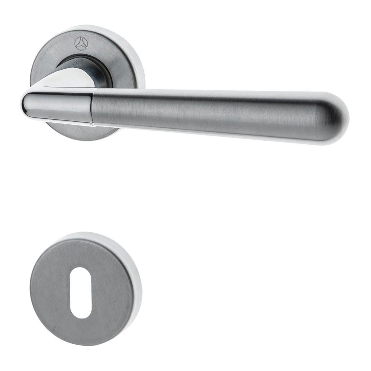 Maniglia con rosetta e bocchetta in Ottone Cromo satinato. Indicata per porta da interno battente con serratura patent