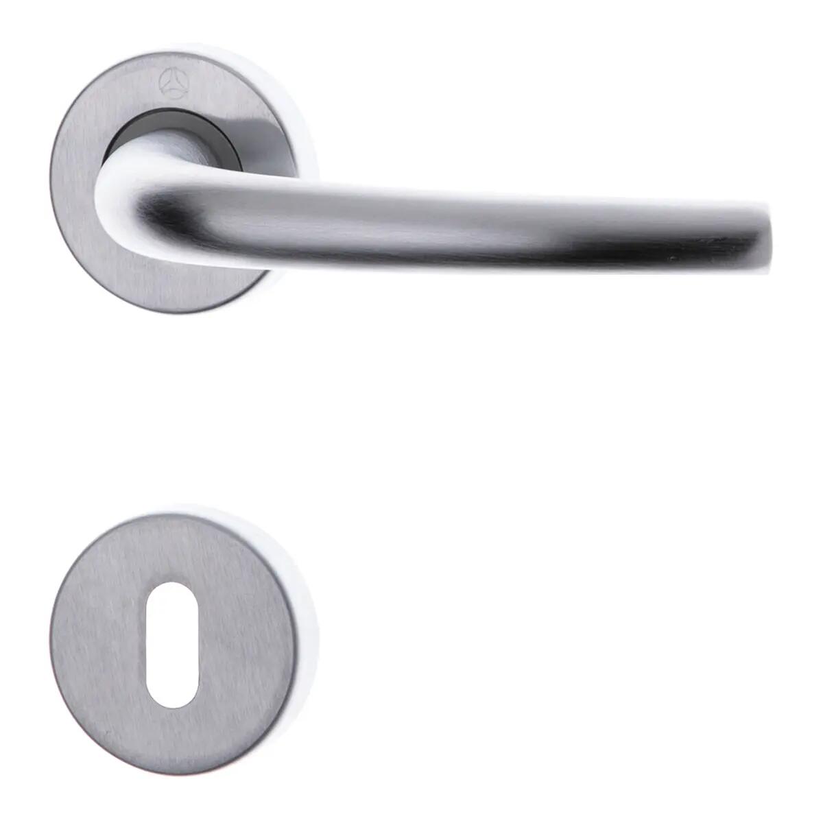 Maniglia con rosetta e bocchetta in Zama Cromo satinato. Indicata per porta da interno battente con serratura patent