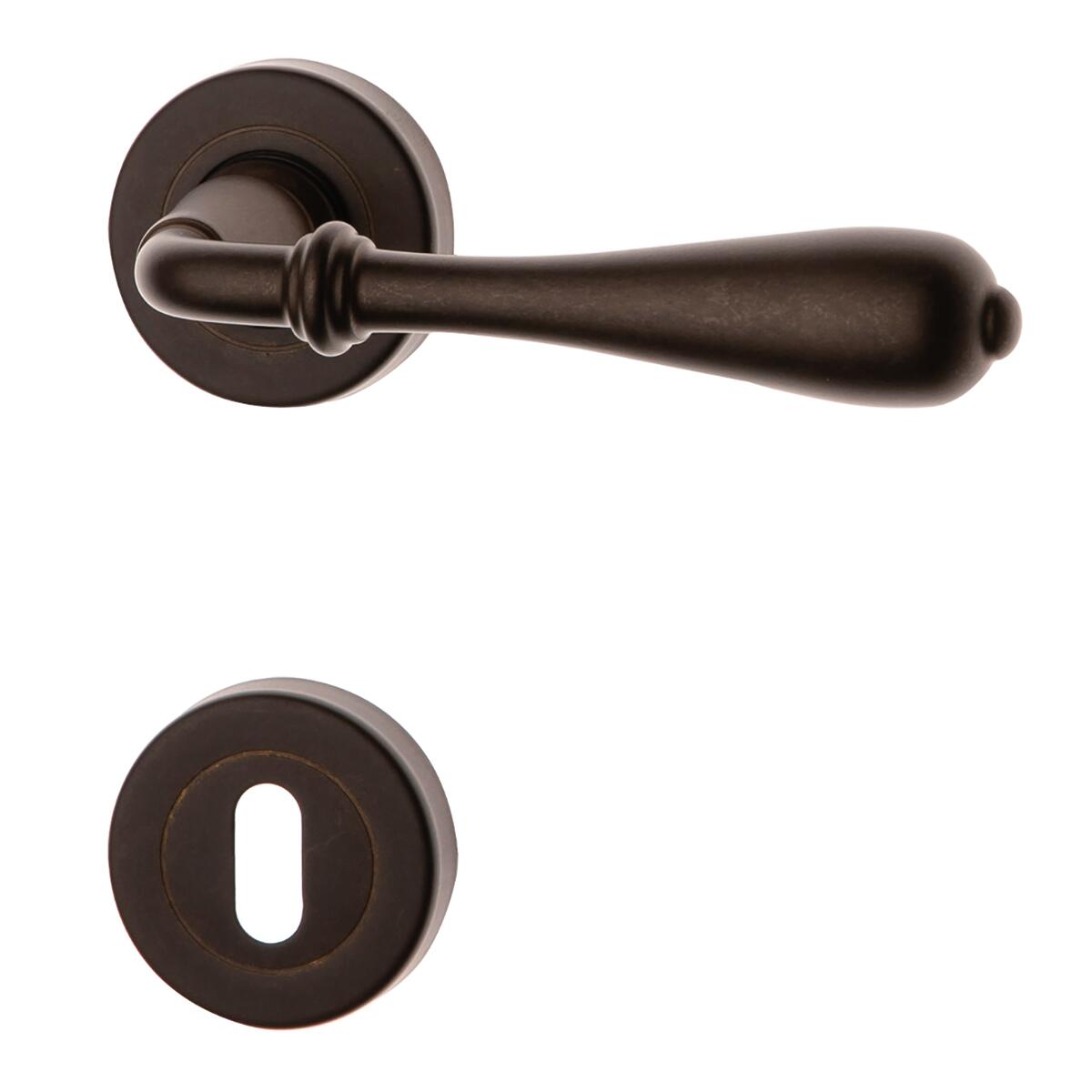 Maniglia con rosetta e bocchetta in Ottone Patinato. Indicata per porta da interno battente con serratura patent