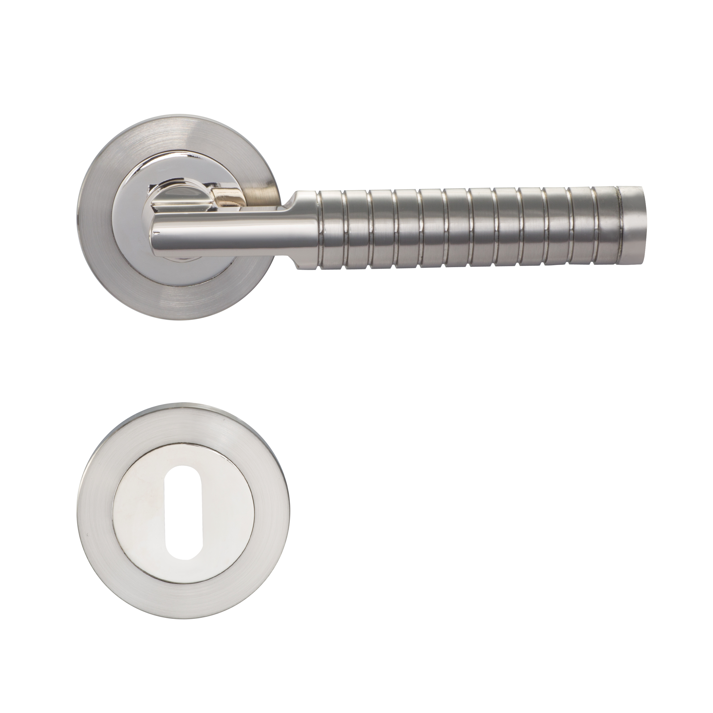 Maniglia con rosetta e bocchetta in Zama Spazzolato. Indicata per porta da interno battente con serratura patent