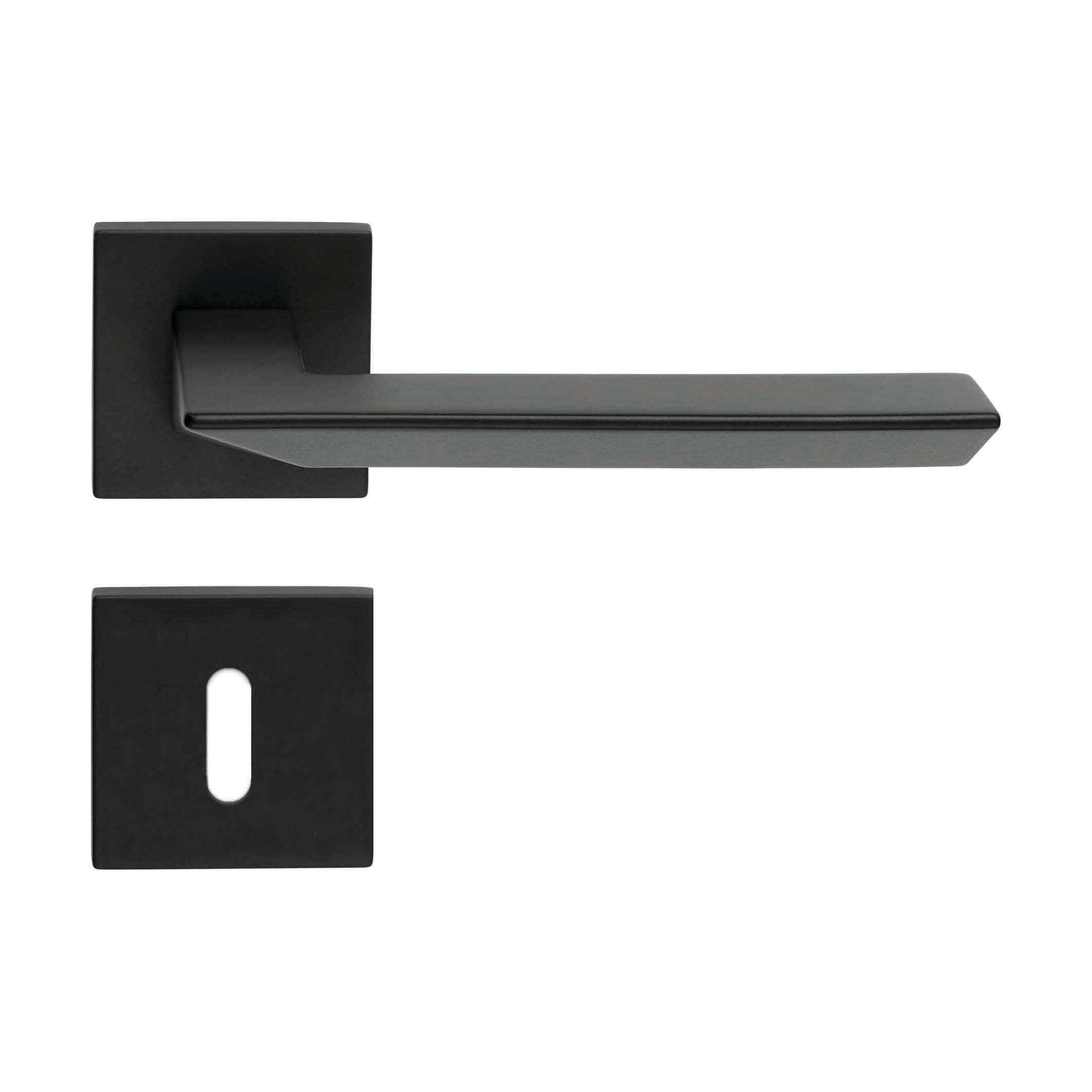 Maniglia con rosetta e bocchetta in Zama Opaco. Indicata per porta da interno battente con serratura patent. Coppia di maniglie, due grani di fissaggio, chiave esagonale per grani, due bocchette, viti da legno, quadro Q8