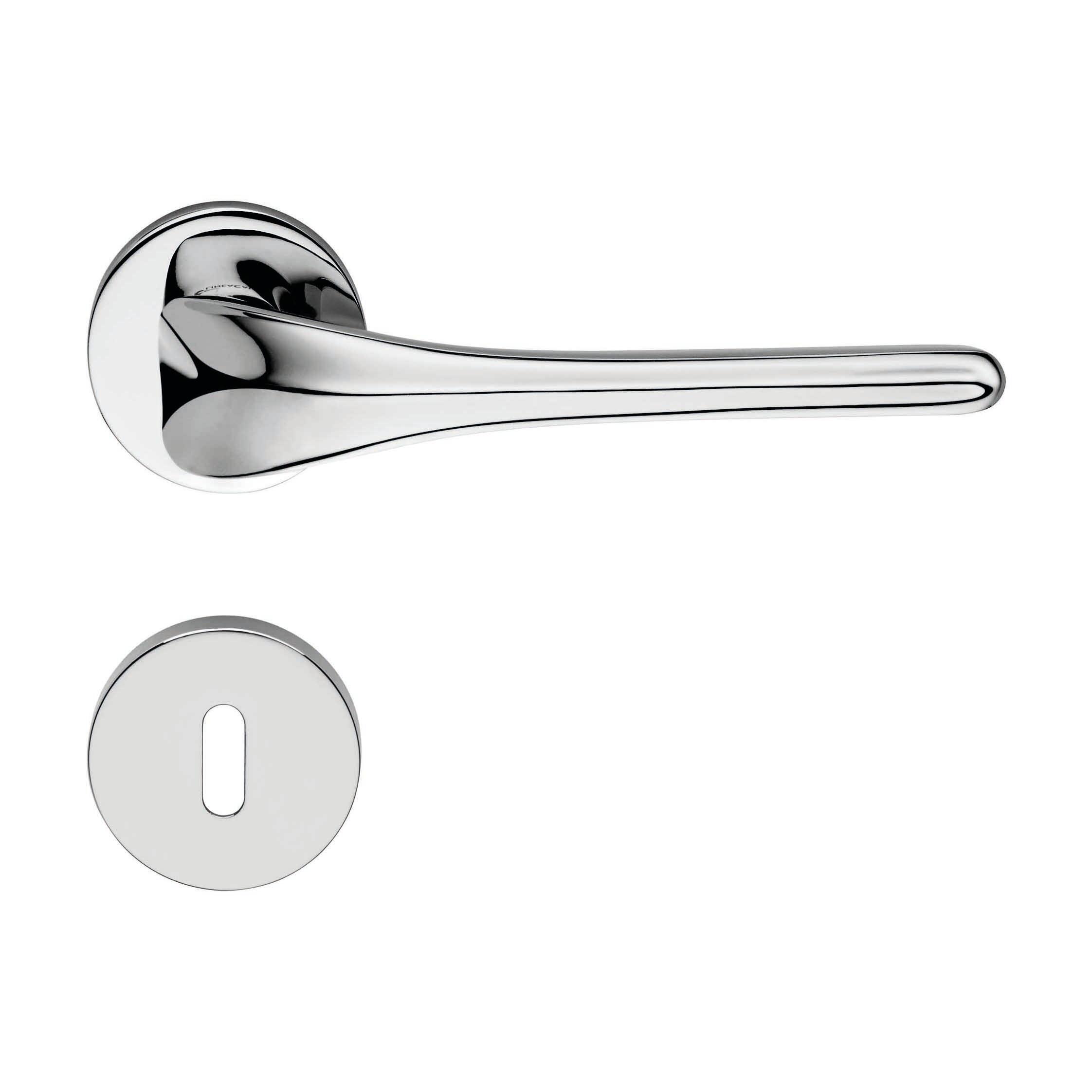 Maniglia con rosetta e bocchetta in Ottone Cromo lucido. Indicata per porta da interno battente con serratura patent. Coppia di maniglie, due grani di fissaggio, chiave esagonale per grani, due bocchette, viti da legno, quadro Q8
