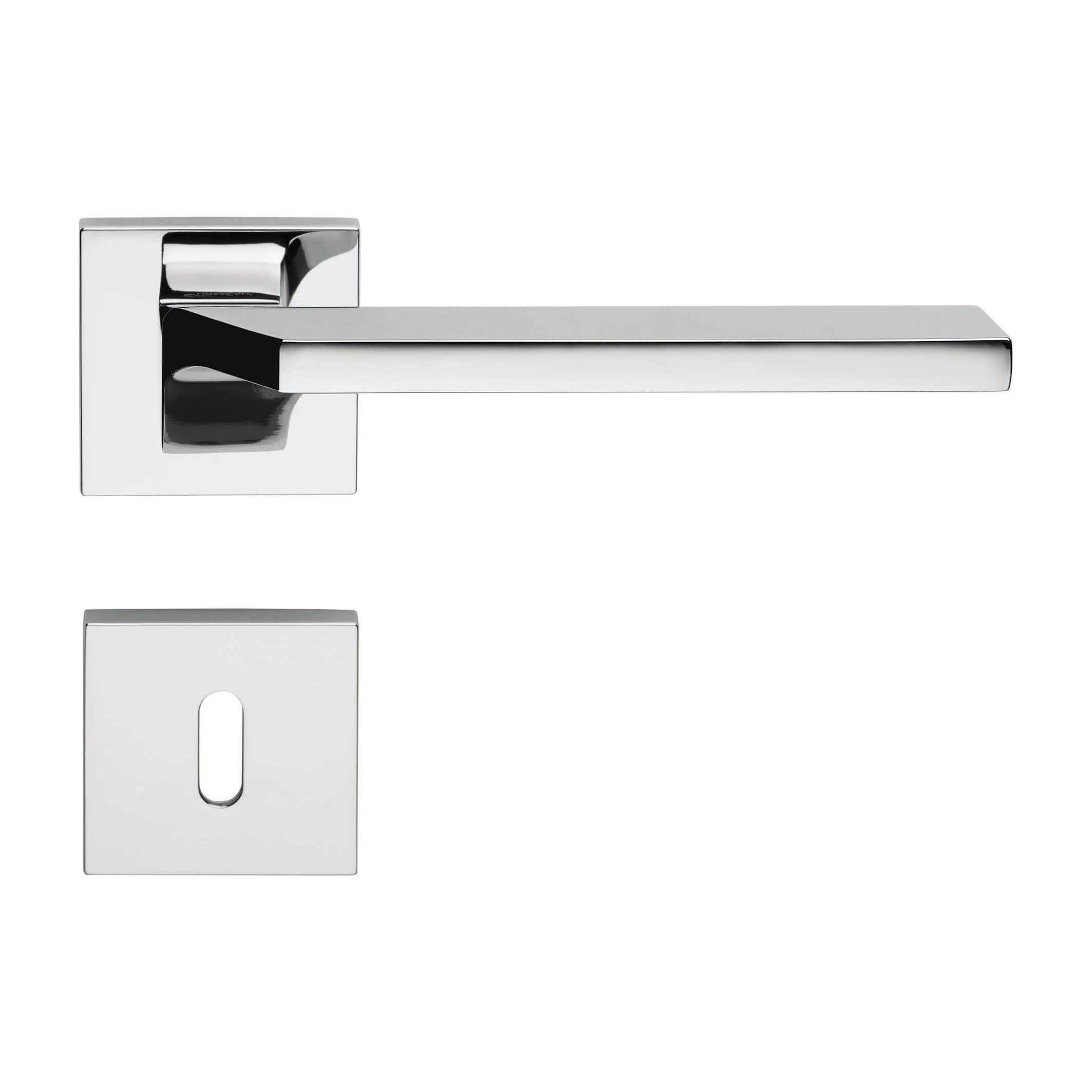 Maniglia con rosetta e bocchetta in Ottone Cromo lucido. Indicata per porta da interno battente con serratura patent. Coppia di maniglie, due grani di fissaggio, chiave esagonale per grani, due bocchette, viti da legno, quadro Q8