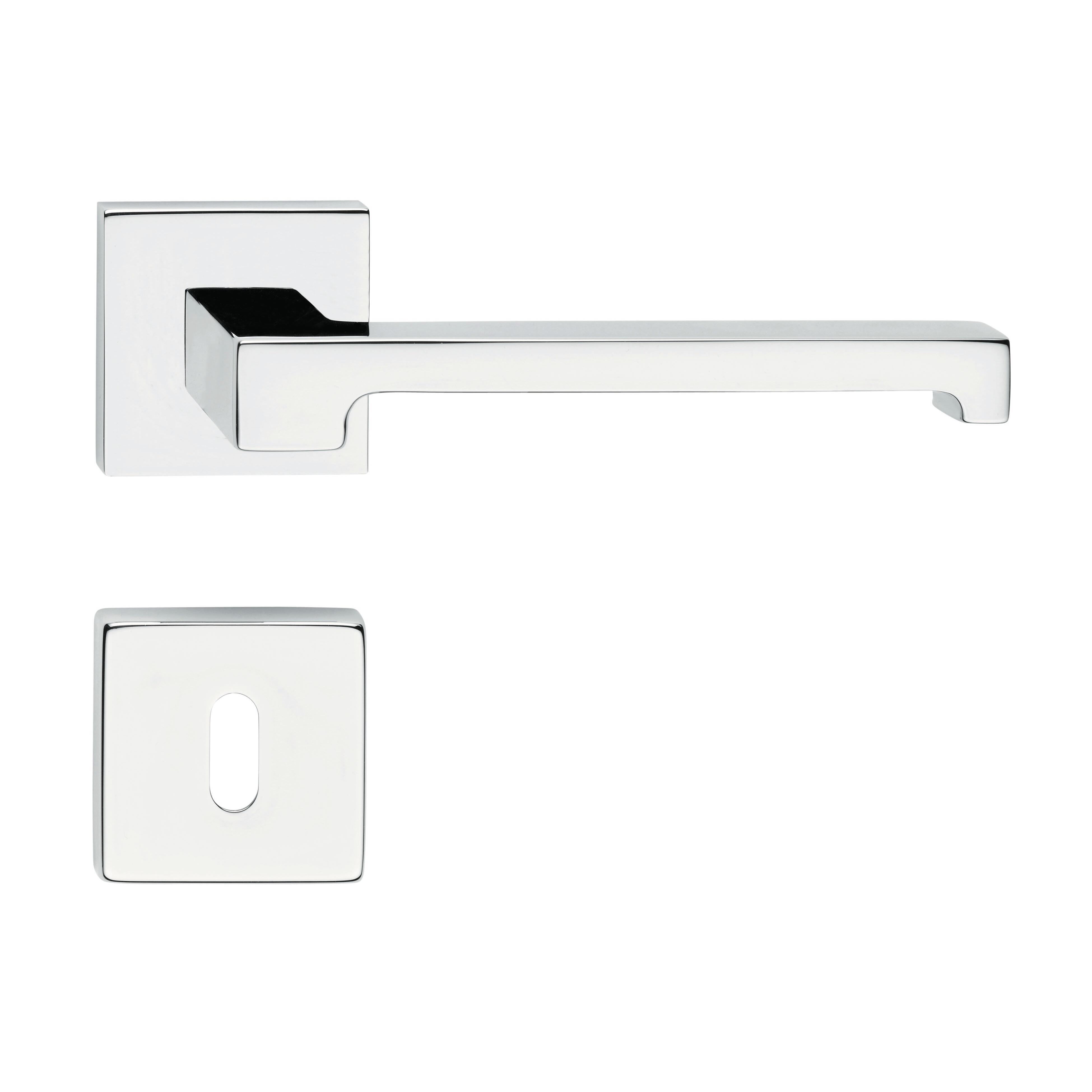 Maniglia con rosetta e bocchetta in Ottone Cromo lucido. Indicata per porta da interno battente con serratura patent. Coppia di maniglie, due grani di fissaggio, chiave esagonale per grani, due bocchette, viti da legno, quadro Q8