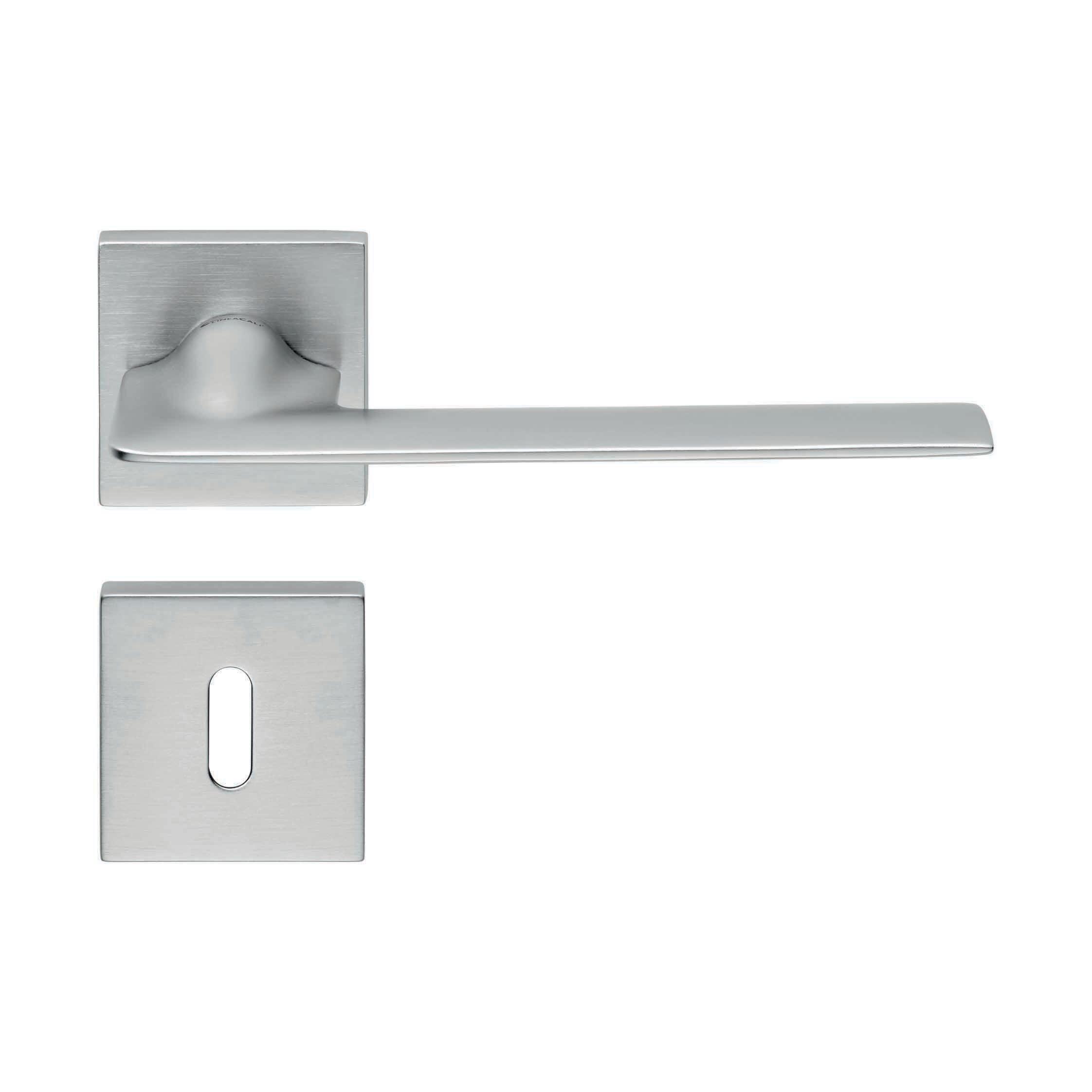 Maniglia con rosetta e bocchetta in Ottone Cromo satinato. Indicata per porta da interno battente con serratura patent. Coppia di maniglie, due grani di fissaggio, chiave esagonale per grani, due bocchette, viti da legno, quadro Q8
