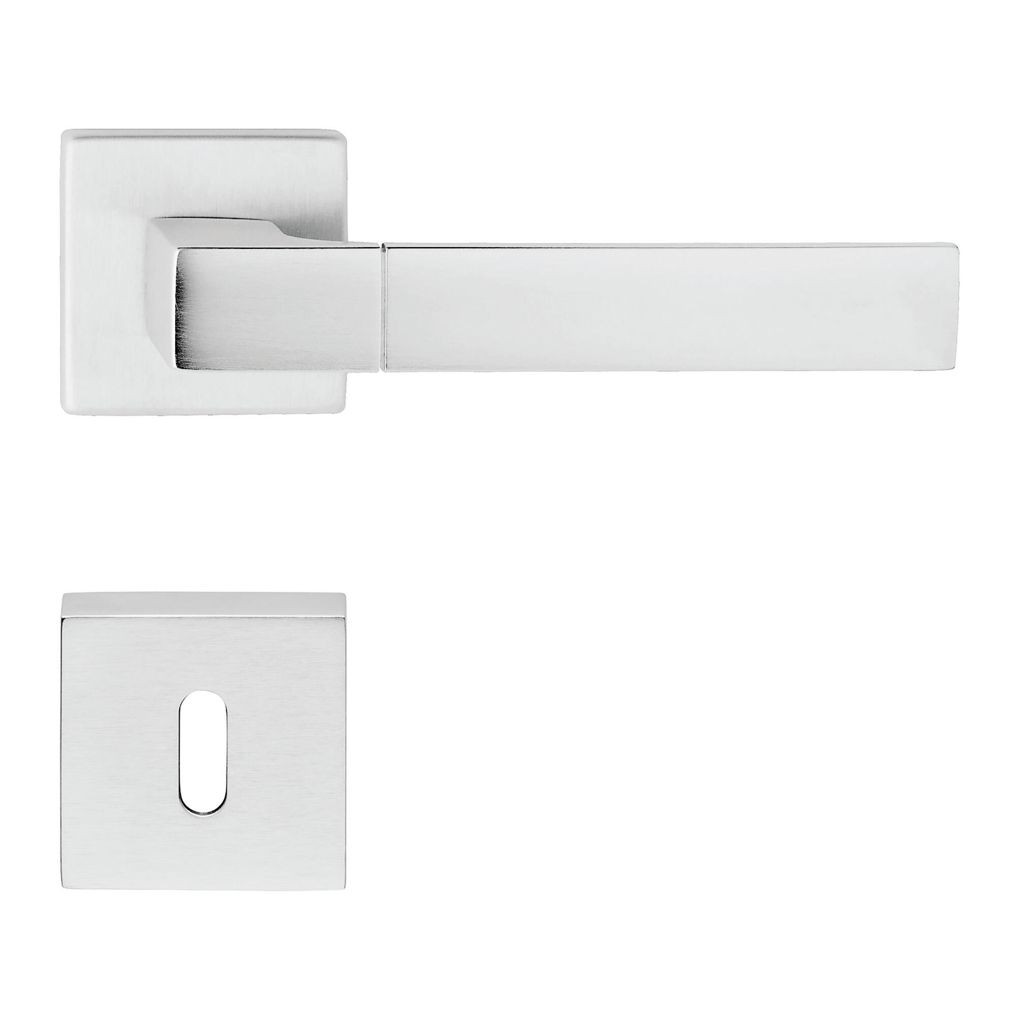 Maniglia con rosetta e bocchetta in Ottone Cromo satinato. Indicata per porta da interno battente con serratura patent. Coppia di maniglie, due grani di fissaggio, chiave esagonale per grani, due bocchette, viti da legno, quadro Q8