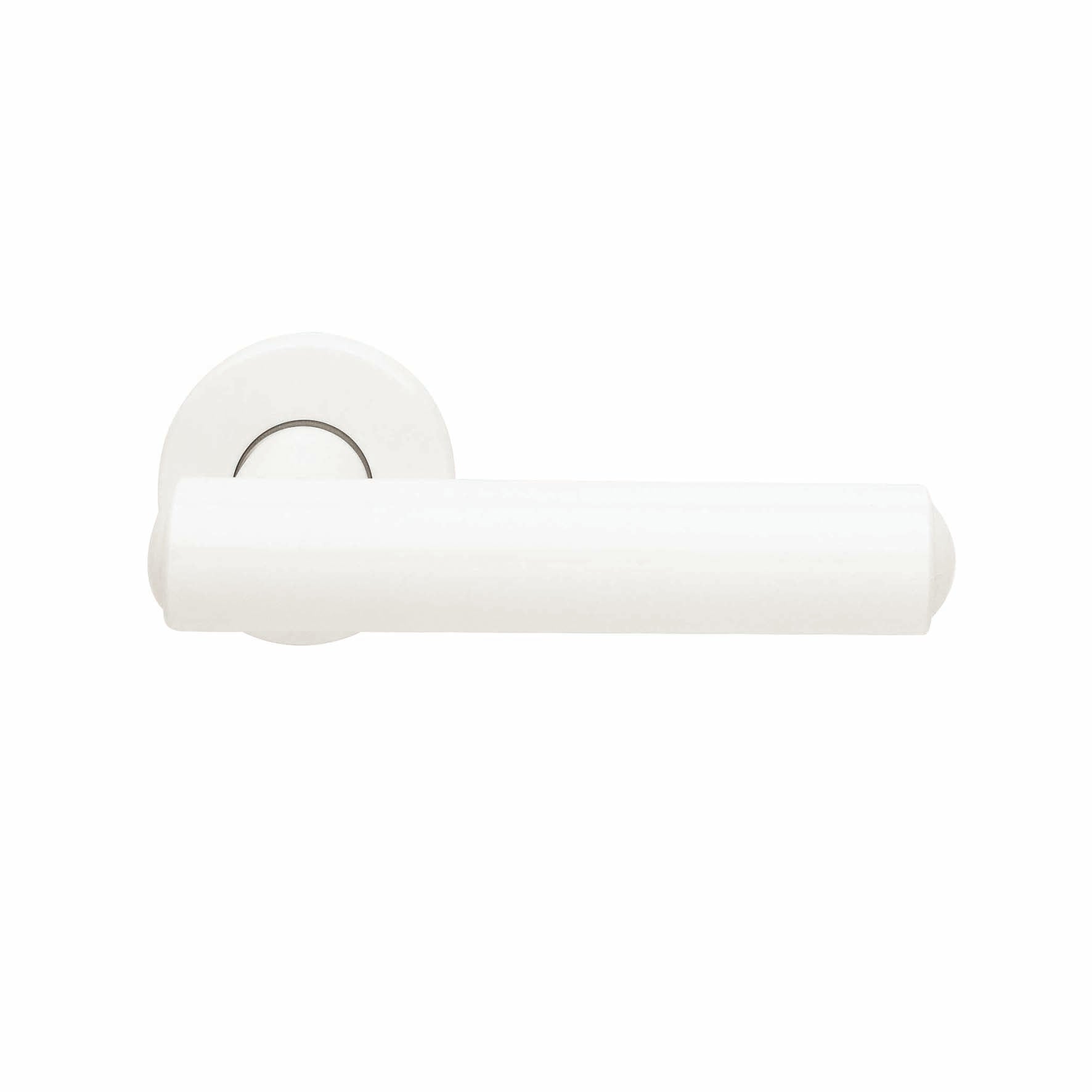 Maniglia su rosetta in Plastica bianco lucido. Indicata per porta da interno battente con serratura patent