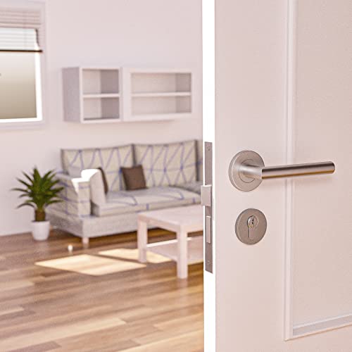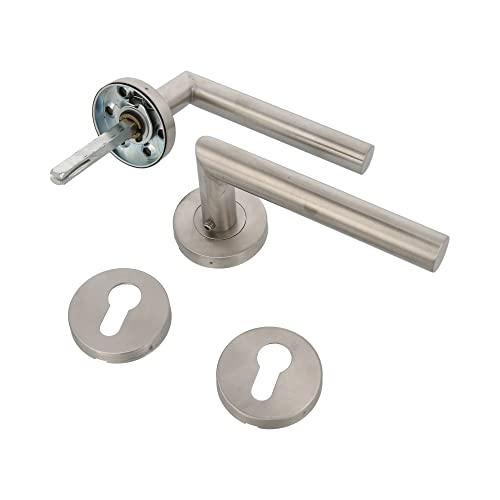Set di maniglie con rosetta: set di maniglie in acciaio inox con rosetta rotonda, per porte interne ed esterne. Design semplice e moderno, con comoda manovella che si adatta alla mano e non scivola. Pulire con un panno umido.