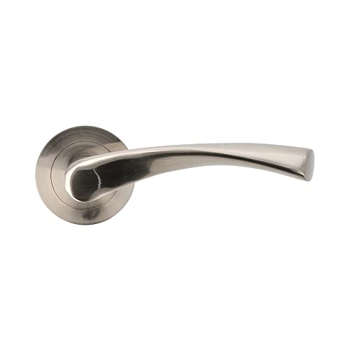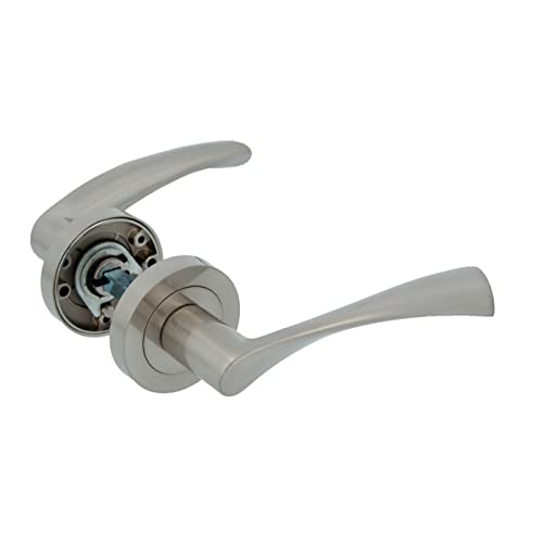 Set di maniglie con rosetta in ZAMAK per porte: set di maniglie in alluminio con rosetta in zama e maniglia curva ergonomica dal design semplice, elegante e moderno. Grazie alla posizione della manovella, si adatta alla mano e non scivola.