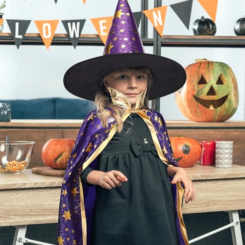 Materiale di alta qualità: Il mantello strega per bambini con il cappello è realizzato in tessuto bronzante, che è liscio, regolabile e morbido, con bordo color oro e design a collo alto. E la fascia è realizzata in tessuto di nylon di alta qualità, morbido al tatto ed elastico da indossare, progettato per adolescenti e adulti per giocare il ruolo di strega o mago. Il mantello è regolabile e ha un legame in modo che possa essere facilmente indossato e tolto.