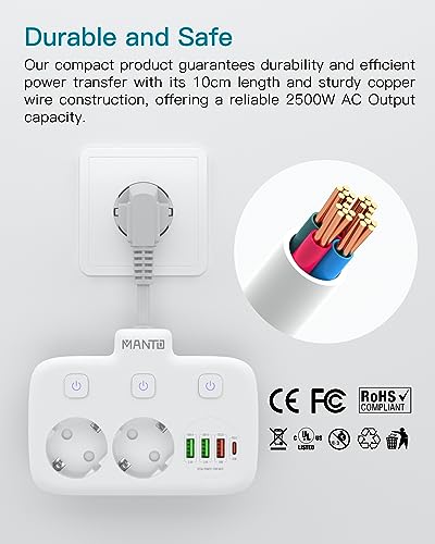 MANTO Ciabatta Multipresa con USB, Ciabatta Elettrica con 3 Indipendenti Interruttore, Presa Multipla con 2 Prese e 3 USB A e 1 USB C per La Casa, l'ufficio, Il Dormitorio, l'hotel
