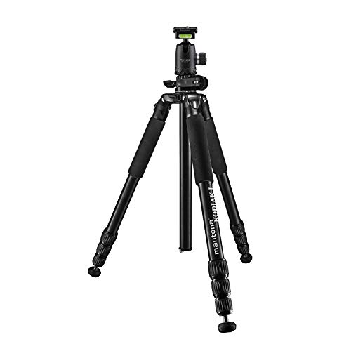 Treppiede in alluminio, altezza con testa a sfera 176 cm, portata 15 kg, testa a sfera esclusiva con portata di 10 kg e controllo della frizione (compatibile con Arca-Swiss), dimensioni della confezione 61 cm, peso 2,12 kg, 4 segmenti di gambe con max. 28 mm di diametro, punte avvitabili, con colonna centrale corta separata per macro ottimali.