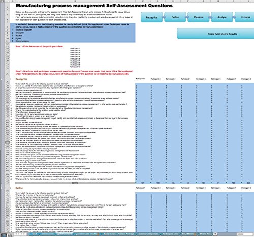 Manufacturing process management Self-Assessment ensures you don't miss anything: More than 630 critical Manufacturing process management success criteria in 7 RDMAICS (Recognize, Define, Measure, Analyze, Improve, Control and Sustain) steps with easy and quick navigating and answering for one or multiple participants