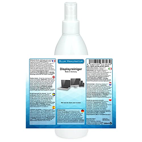 Blum Manufaktur Detergente per display, 2 x 250 ml, per la pulizia dello schermo, per PC, con panno in microfibra da 30 x 30 cm, versatile, prodotto in Germania