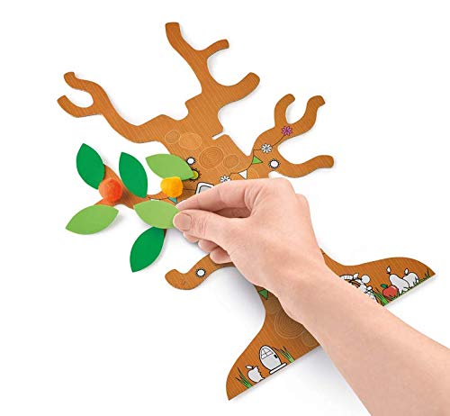Il set include un albero e una casetta da montare, 12 punte in feltro, pulisci tubi, fogli di adesivi, pom-pom, 5 tubi di colla glitter, foglie di schiuma e fiori in feltro.