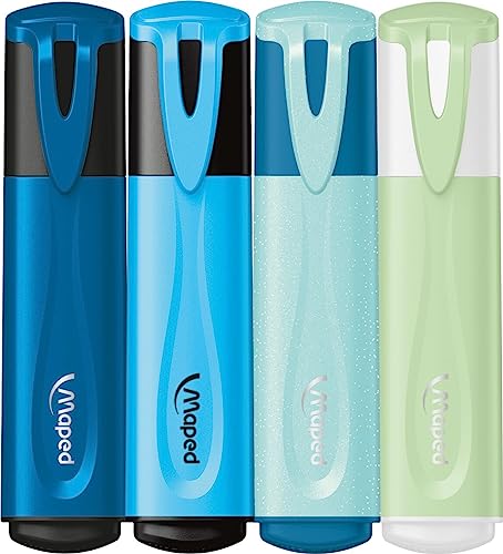 Maped - 4 Evidenziatori Fluo'Peps - Punta smussata - Evidenziatori a lunga durata - Uso scolastico e professionale - Evidenziatori pastello, fluorescenti e inchiostro glitterato - tema oceano