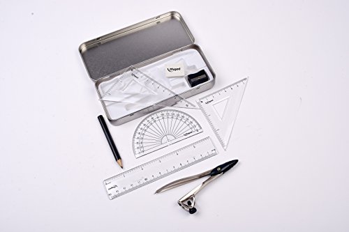 Set composto da: compasso, righello di 15 cm, goniometro, 2 squadre, gomma, temperamatite, matita.