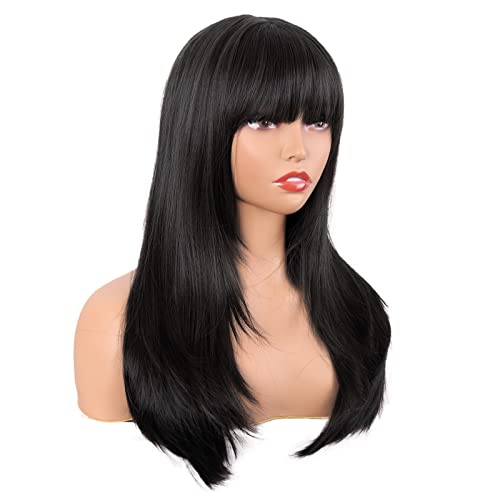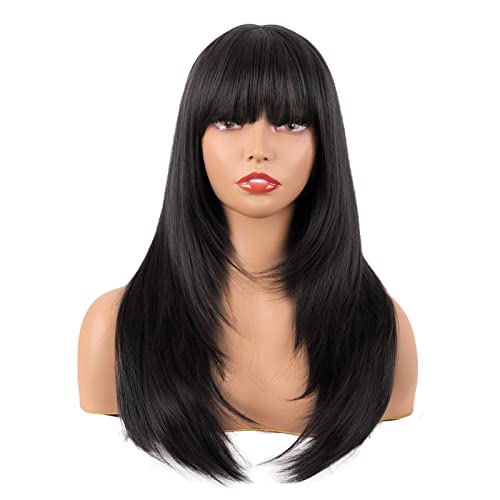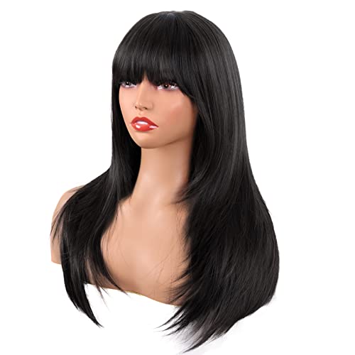 MapofBeauty 24 Pollic/60 cm Lungo Lisci Layered parrucca Con Frange Sintetico Capelli Shoulder Lunghezza per Quotidiano Utilizzo (Nero)
