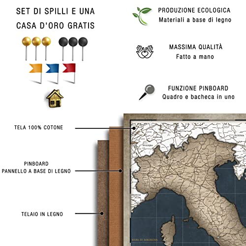 Mappa dell'Italia in tela con bacheca in sughero per appuntare le destinazioni di viaggio - Lavagne in tela di alta qualità con mappa dell'Italia in varie dimensioni (90x75cm, modello 2)