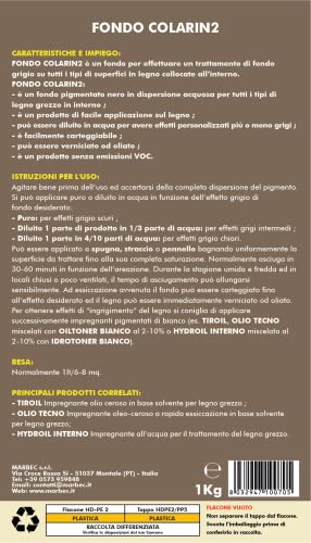 MARBEC FONDO COLARIN2 1KG Prodotto per effettuare un trattamento di fondo grigio su tutti i tipi di superfici in legno collocate all'interno.