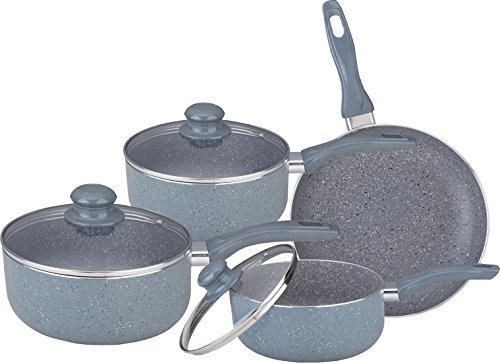 7PC MARBLE COATED ALUMINIUM NON STICK COOKWARE SET FRYING PAN SAUCEPAN GLASS LID grigio