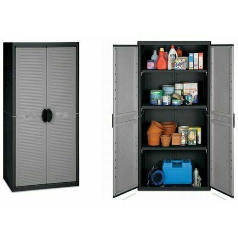 Mod. JUMBO in polipropilene. Certificato TÜV Ottima resistenza agli agenti atmosferici. Doppia anta, tre ripiani interni regolabili in altezza. Portata ripiano 20 kg Dotato di chiusura antivento. Possibilità di chiusura con lucchetto (non incluso).