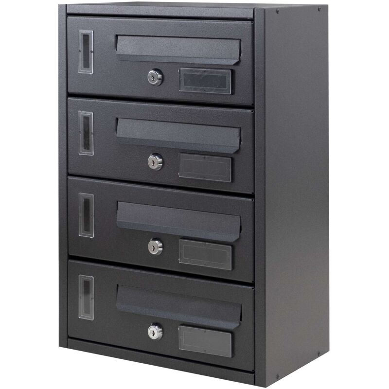 1,0 PZ Di CASSETTA CONDOMINIO MODULAR 4 ANTRACITE Mod. MODULAR 4 Set quattro cassette orizzontali in unico blocco, modulari e per uso condominiale, in acciaio 6 mm verniciato antracite. Dotate di targhetta portanome, finestrella ispezione, e due chiavi numerate. Predisposizione fissaggio a muro.Dimensioni cm 30x17x42h