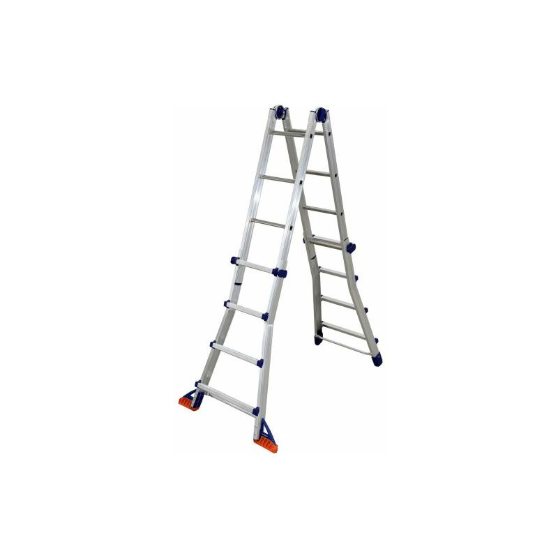 Mod. BRICO BLUin alluminio.Utilizzabile a cavalletto, a sistema zoppo e a sfilo.Uso professionale intensivo.Gradini mm 30x30Portata 150 kgA norme europee EN 131-4