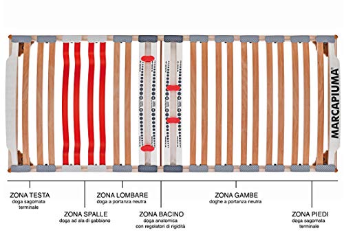 26 doghe a listelli in legno di faggio curvato 36x8 mm, nella parte centrale doppie doghe e cursori regolabili per cambiarne la rigidità e nella zona spalle sagomate ad ali di gabbiano
