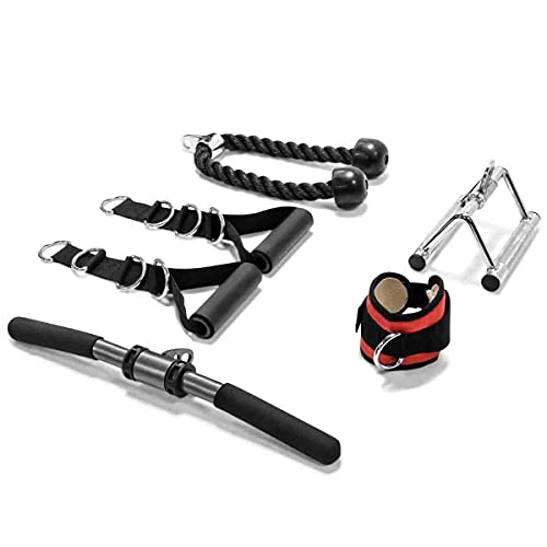 2 maniglie a D, barra a V cromata, barra dritta, corda tricipite, cinghia alla caviglia | 4 pali di stoccaggio, contiene piatti da 2,5 cm o 2 cm | Il rack contiene barre da 2,1 m