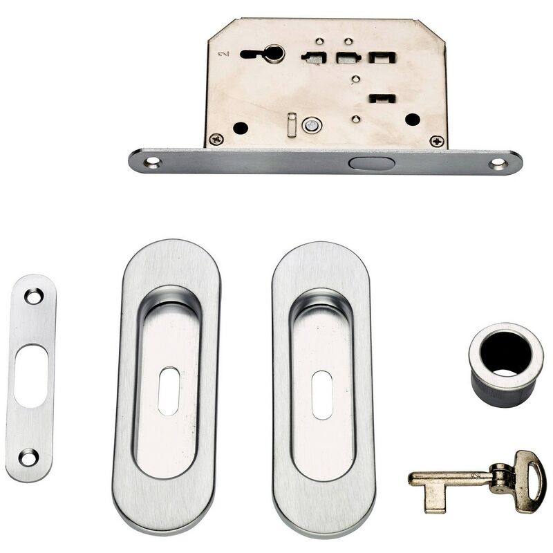 Composto da: - serratura solo chiave entrata 50 mm - coppia nicchie in ottone mm 25x88 con foro chiave - chiave snodata -nicchia di trascinamento ¦ 25 mm finitura cromo satinato