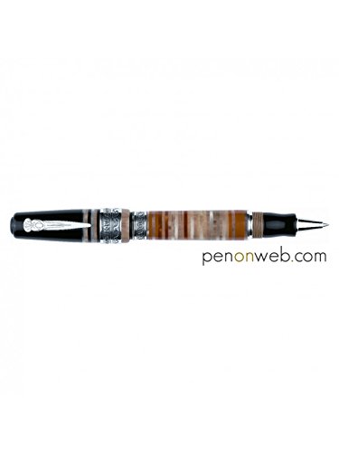 Materiale: Il fusto della penna è in resina italiana ad anelli multicolori, incollati a mano uno per uno e rifiniti a mano con precisione infinitesimale. Impugnatura e parte del cappuccio sono in resina nera.
